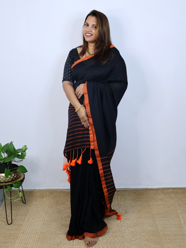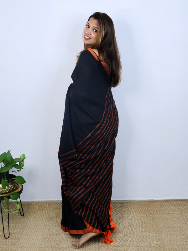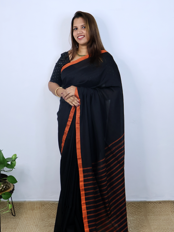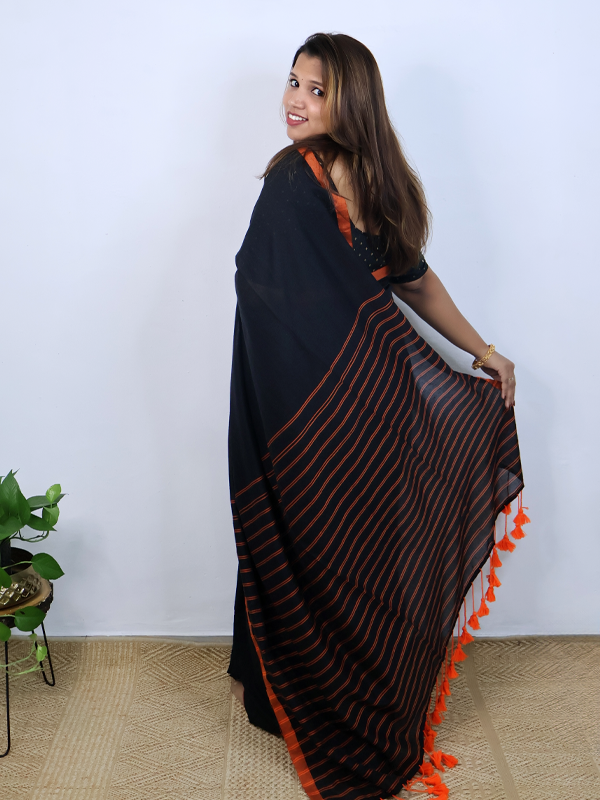 Home Sarees Mul Mul Sthree Black with orange border saree